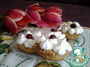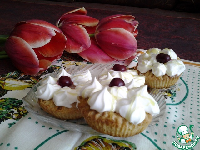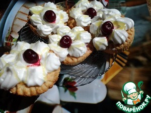 Сладкие рассыпчатые корзиночки из песочного теста с вишневым йогуртом и вареньем, украшенные нежными взбитыми сливками
