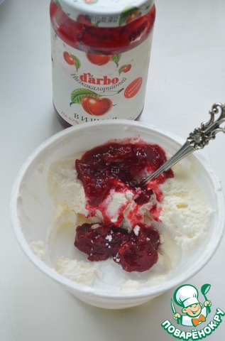• Рикотту смешать с конфитюром, по вкусу добавить сахарную пудру