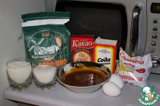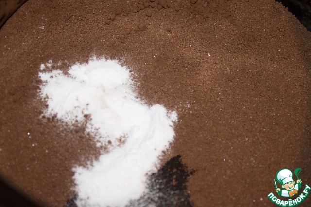 В удобной посуде смешать 0,5 ст. сахара, какао, ванилин и соду.