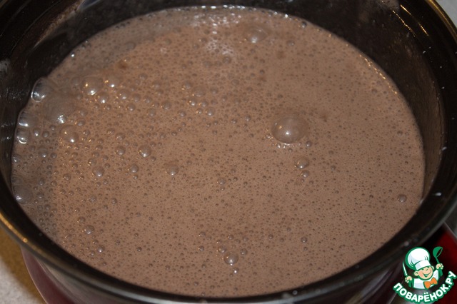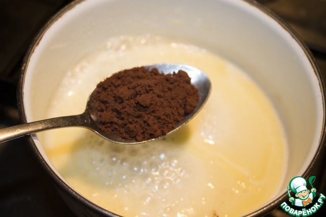 Масло, молоко и сахарную пудру доводим до кипения и добавляем, помешивая, какао-порошок. -
