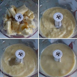 Бананы очистить, нарезать на небольшие кусочки и измельчить в блендере. Когда масса станет однородной, добавить воду и перемешать.