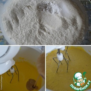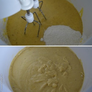 Когда банановая смесь соединилась с другими ингредиентами, постепенно, по 1 ст. л., добавляем сухие ингредиенты, перемешивая миксером на небольшой скорости.