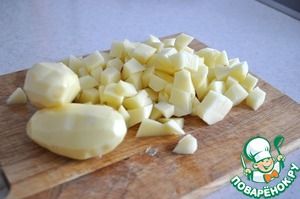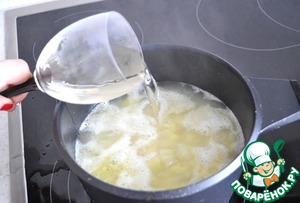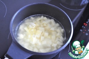 Добавить к луку с чесноком и долить воды так, чтобы она полностью покрывала картофель.