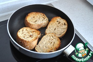 В это время обжариваем на сухой сковородке ломтики хлеба,