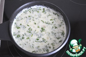 Как только картофель будет готов, влить молоко. Довести до кипения, посолить, поперчить, добавить нарезанную зелень, щепотку мускатного ореха. Слегка мнём наш картофель. Пускай останутся кусочки.