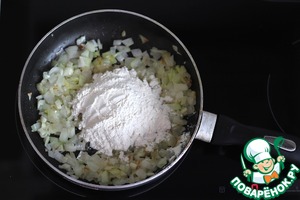 Добавить муку и обжаривать, постоянно помешивая, ещё 1 минуту.