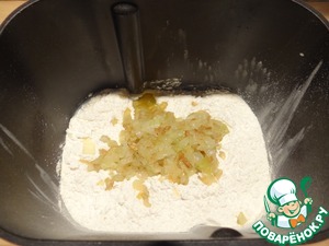 Добавляю просеянную муку, соль, сахар, остывший обжаренный лук с оливковым маслом.