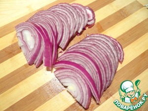 Красный репчатый лук чищу, мою и нарезаю полукольцами.