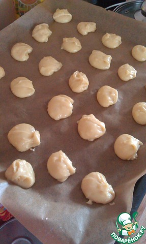 Затем противень застилаем пергаментной бумагой и выкладываем чайной ложкой наши эклеры (размер делаете, как вам нравится, главное, учтите, что они увеличатся в 1,5-2 раза при правильном выпекании).