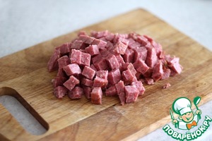 Нарежем небольшими кусочками сервелат (на фото 4 ломтика, но как по мне - 2 будет достаточно)