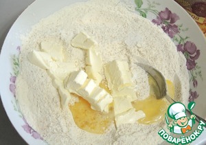 Затем добавляем немного взбитое яйцо, разрыхлитель, соль и 120 г масла, порезанного кубиками.