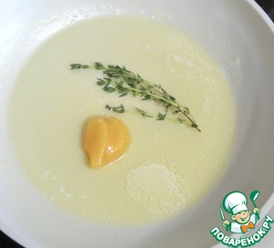 В сковороду вливаем оливковое масло, добавляем 40 г сливочного масла, мед, веточку тимьяна.