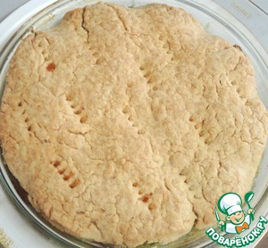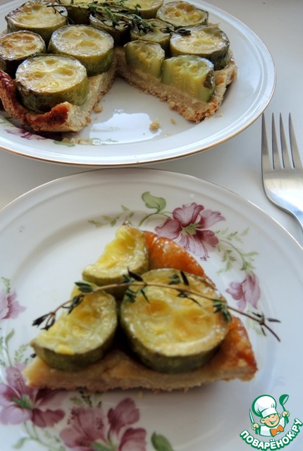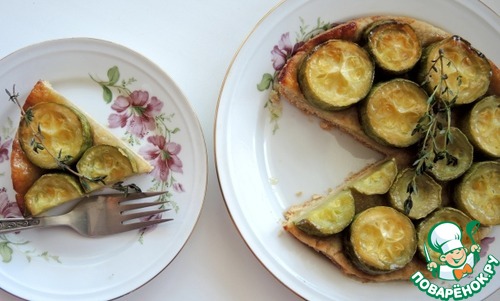 Выкладываем кабачки в форму для выпечки, поливаем соком от жарки, накрываем тестом. Тесто прокалываем вилкой в нескольких местах.