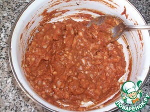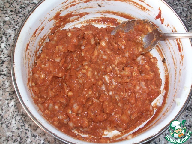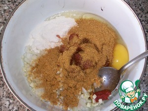 Чеснок и лук мелко режем, складываем в любую удобную для вас посуду. Муку, томат-пасту, приправу туда же