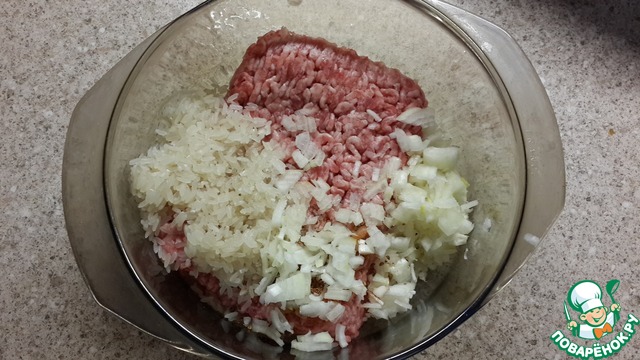Фарш смешать с мелко порезанным луком и предварительно отваренным до полуготовности рисом. Соль, специи по вкусу