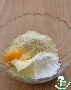 Сливочное масло размягчить до комнатной температуры. Смешать с яйцом, сахарной пудрой, молотым миндалем. Не взбивать, хорошо перемешалось и ладно.