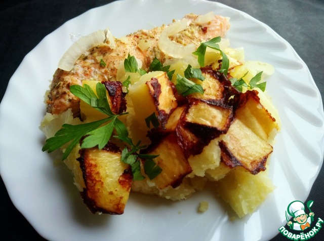 Рыбка получается очень сочная и ароматная, картофель на дне с золотистой корочкой, а тот, что ближе к рыбке, остается светлым.