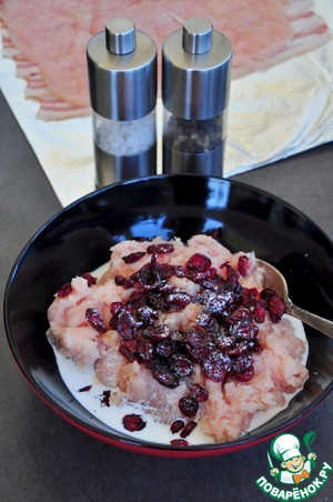 Если не любите кисло-сладкий привкус сушеной клюквы, замените ее на маслины или оливки без косточек, предварительно их нарезав. Так же, при желании, фарш можно чуть подкрасить молотой паприкой. -