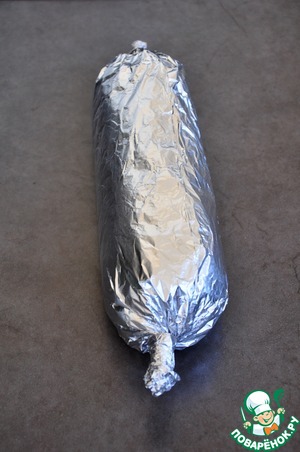 Завернуть в еще один-два слоя фольги, чтобы во время запекания не вышел сок из рулета на противень и не начал гореть. Готовить в предварительно разогретой духовке до 180* - 30 минут.
