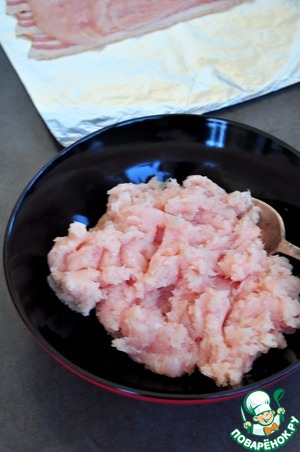 Внешнюю гладкую часть филе зачистить от пленок, нарезать тонко, хорошо отбить молотком для отбивных. Выстелить плотным слоем отбитое филе на бекон.