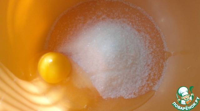 Во второй части яйцо и сахар взбиваем в крутую пену