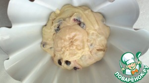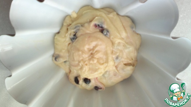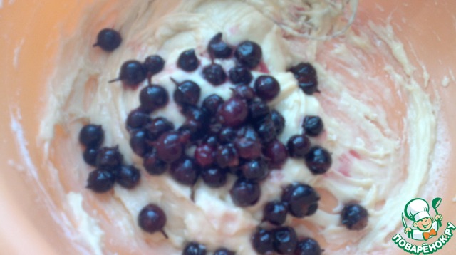 Соединяем обе части, добавляем муку, разрыхлитель и ванильный сахар - слегка перемешиваем, добавляем смородину
