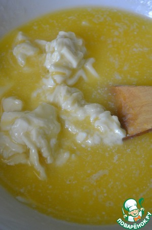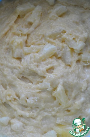 В подошедшее тесто добавить кусочки ананаса и коньяк.