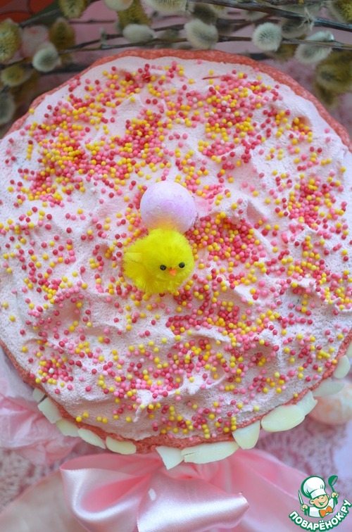 Белок взбить с сахаром 100г до устойчивых пиков, подкрасить пищевым красителем, нанести на кулич, сверху украсить кондитерской посыпкой.