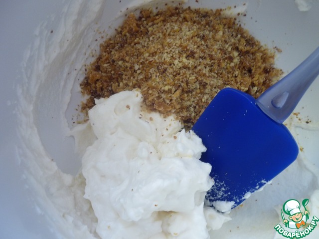 • Яичный белок взбиваем со столовой ложкой коричневого сахара до устойчивых пиков и аккуратно соединяем с ореховой смесью.