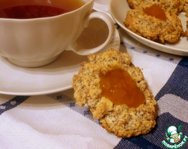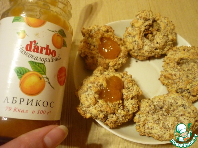 • Печенье немного остужаем, снимаем с бумаги и в центр каждого (вы же помните мы там делали небольшое углубление) добавляем 1 ч. л абрикосового низкокалорийного конфитюра D'arbo