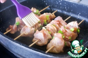 Для маринада якитори необходимо смешать соевый соус/либо терияки с рисовым уксусом, саке и сахаром/медом либо глюкозным сиропом. К счастью, компания Киккоман уже сделала это за нас. Поэтому к мясу достаточно добавить 5 ст. ложек маринада "якитори" от Киккоман и оставить хорошо промариноваться.