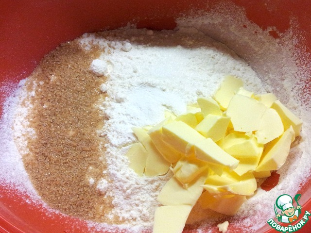 • В ёмкость просеять муку, насыпать разрыхлитель, ванилин, сахар, положить сливочное масло и разбить яйца.