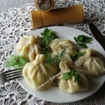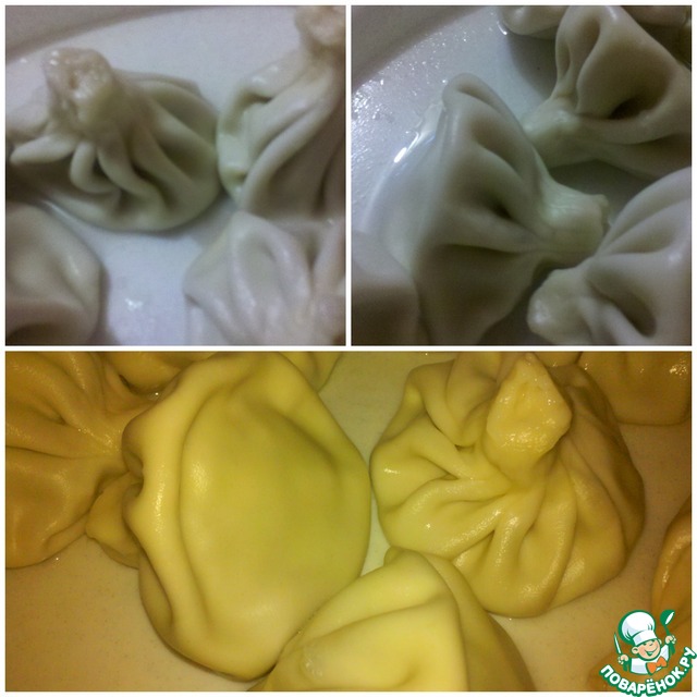 В классическом варианте у каждого хинкаля (?) должен был быть такой … ну типа перевязанного горлышка как у мешка. Или хохолка. За который потом его, хинкаль, надо брать и прокусывать сначала, чтобы сок выпить, а потом уже и есть. Я попробовал такой сделать. Видите, он на первом плане.