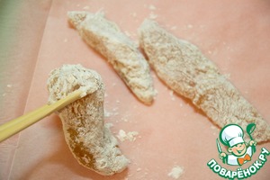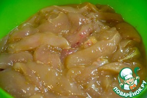Курицу нарезать тонкими полосками и замариновать в соусе минимум на 20 минут.