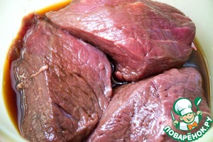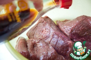 Говядину залить соевым соусом и оставить пропитываться 30 минут.