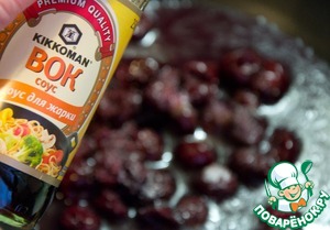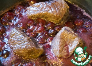 Для приготовления соуса на сковороду выложить вишню, добавить мясной сок (из фольги), сахар, соус для жарки.