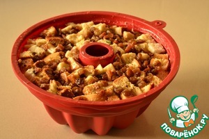 Прогреваем духовку до 170 градусов. Теперь укладываем кусочки кулича в форму. Слегка их придавливаем.