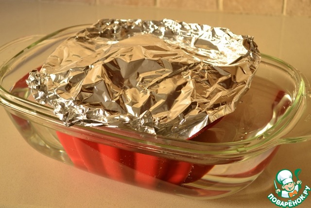 Берем глубокий противень или форму, помещаем в нее форму с подготовленной массой и наливаем воду. Вода должна быть до 2/3 высоты формы. Форму с кейком накрываем сверху фольгой. Ставим эту конструкцию в духовку и забываем о ней часа на полтора.