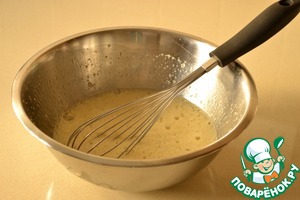 Затем подогревшуюся смесь молока и сливок потихоньку добавляем в яичную смесь, постоянно помешивая венчиком в быстром темпе. Добавляем коньяк (или ароматизатор "ром", если будут кушать дети).