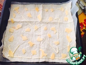 Противень застелить пекарской бумагой. Положить первый слой лаваша, добавив немного сыра и слегка смазать майонезом (это для того, чтобы при выпекании слои лаваша схватились вместе). У меня сыр был нарезанный, пришлось рвать его на мелкие ломтики, хотя было бы удобней потереть на тёрку.