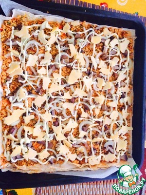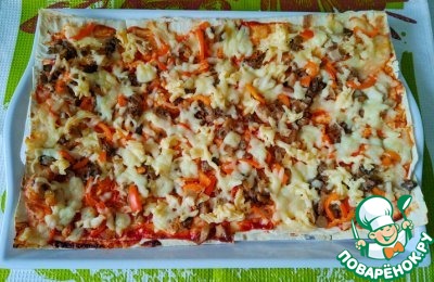 Данный рецепт имеет два неоспоримых преимущества: во-первых, готовится крайне быстро, и, во-вторых, пицца получается необыкновенно хрустящая, сочная, вкусная! Для потчевания неожиданных гостей - просто палочка-выручалочка! С начинкой можно экспериментировать на ваше усмотрение. Предлагаю свой вариант: у меня не было времени сходить в магазин, поэтому начинку приготовила из продуктов, которые имелись в холодильнике. Получилось крайне вкусно, гости умяли пиццу за считанные минуты так и не догадавшись, что основа пиццы - лаваш!