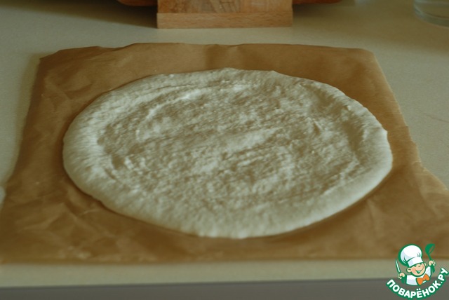 Распределяем тесто на форме для выпечки пиццы или бумаге для выпечки. Оставляем на расстойку на 40 минут.