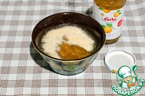 В миску влить 100 мл. яблочного сока, 100мл. низкокалорийного конфитюра D’arbo - абрикос и 5 г желатина. Дать набухнуть желатину, согласно инструкции на упаковке. После этого разогреть абрикосово - яблочную массу на медленном огне, чтобы желатин растворился, но НЕ ДОВОДИТЬ до кипения.
