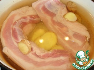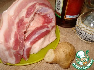 Сначала свинину надо сварить. Для этого понадобится 50 гр имбиря, 150 мл коньяка ( в оригинале авамори - местная рисовая водка) и 60 мл рисового уксуса.
