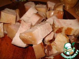 Режем ломти свинины так, чтобы шкурка каждого куска выглядела квадратной.