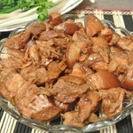 В кастрюлю кладем свинину, нарезанную на длинные ломти толщиной 2 см. Добавляем имбирь, нарезанный кружочками. Заливаем коньяком и уксусом и добавляем воду, чтобы вся свинина была погружена в жидкость. Доводим до кипения, накрываем крышкой и варим на маленьком огне 2 часа.