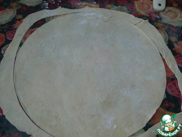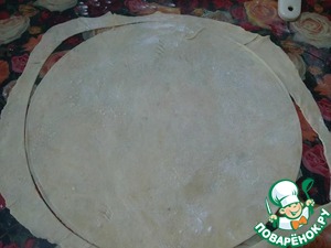 Охлажденные кусочки теста раскатать по очереди в тонкие лепешки, сразу тарелочкой или трафаретом вырезать нужные вам круги ( у меня 26 см. диаметром)и выпекать в заранее разогретой до 200 гр. духовке ( где-то по 6-7 минут) до слегка бежевого цвета. Обрезки собрать и испечь, затем превратить в крошку, для украшения.