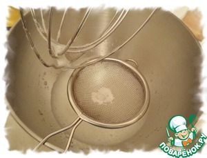 Начинаем взбивать белки до небольшой пены и просеиваем закрепитель. Если вы делаете без закрепителя то этот шаг пропускаем.