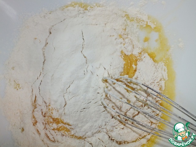 • Всыпать муку, затем крахмал. Тщательно размешать (я венчиком)