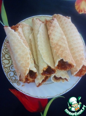 Я выкладывала 1 ст. л. теста в центр, закрывала вафельницу, по готовности свернула в трубочки. Делала на пробу, поэтому без крема. Вафли получаются хрустящие.